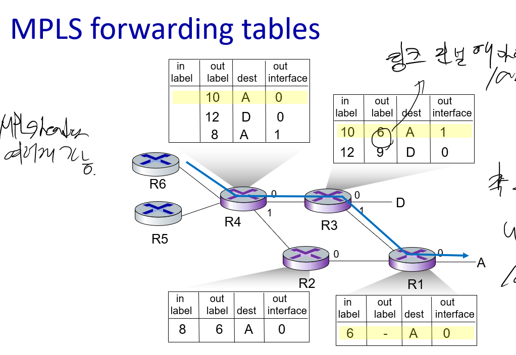- MPLS forwarding table에 어떻게 됐을때 어떻게 할지 다 적혀있음