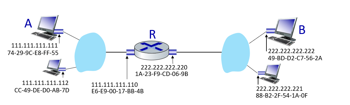 1. 먼저 R의 맥주소를 dest로 해서 보냄 (이때 ip dest는 당연 B로 설정)2. R에 도착하면 프레임에서 데이터그램으로 받음3. R은 도착 인터페이스를 결정하고(ARP table 활용) B의 MAC주소를 dest로하여 데이터그램에서 link layer frame으로 캡슐화하여 만들어냄4. B는 프레임 받아서 datagram추출해서 ip layer로 전달