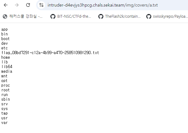 현재 접근가능한 위치 중 하나가 ./wwwroot/img/covers 이기에 ls / > ./wwwroot/img/covers/a.txt 이 방식으로 해줬다.