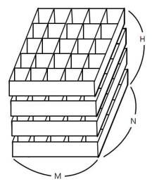 첫 줄에는 상자의 크기를 나타내는 두 정수 M,N과 쌓아올려지는 상자의 수를 나타내는 H가 주어진다. M은 상자의 가로 칸의 수, N은 상자의 세로 칸의 수를 나타낸다. 단, 2 ≤ M ≤ 100, 2 ≤ N ≤ 100,